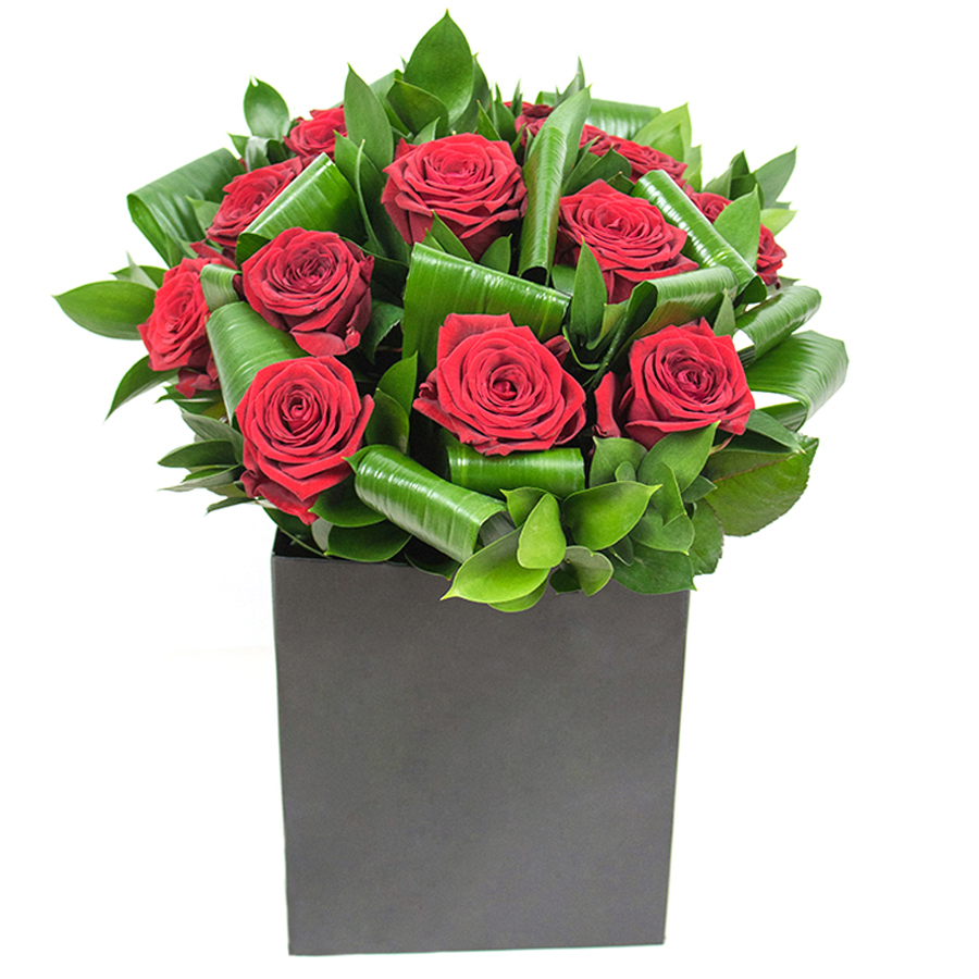 Our stunning red rose arrangement features vibrant red roses, lush aspidistra leaves, and elegant ruscus, creating a unique and captivating display for any space.