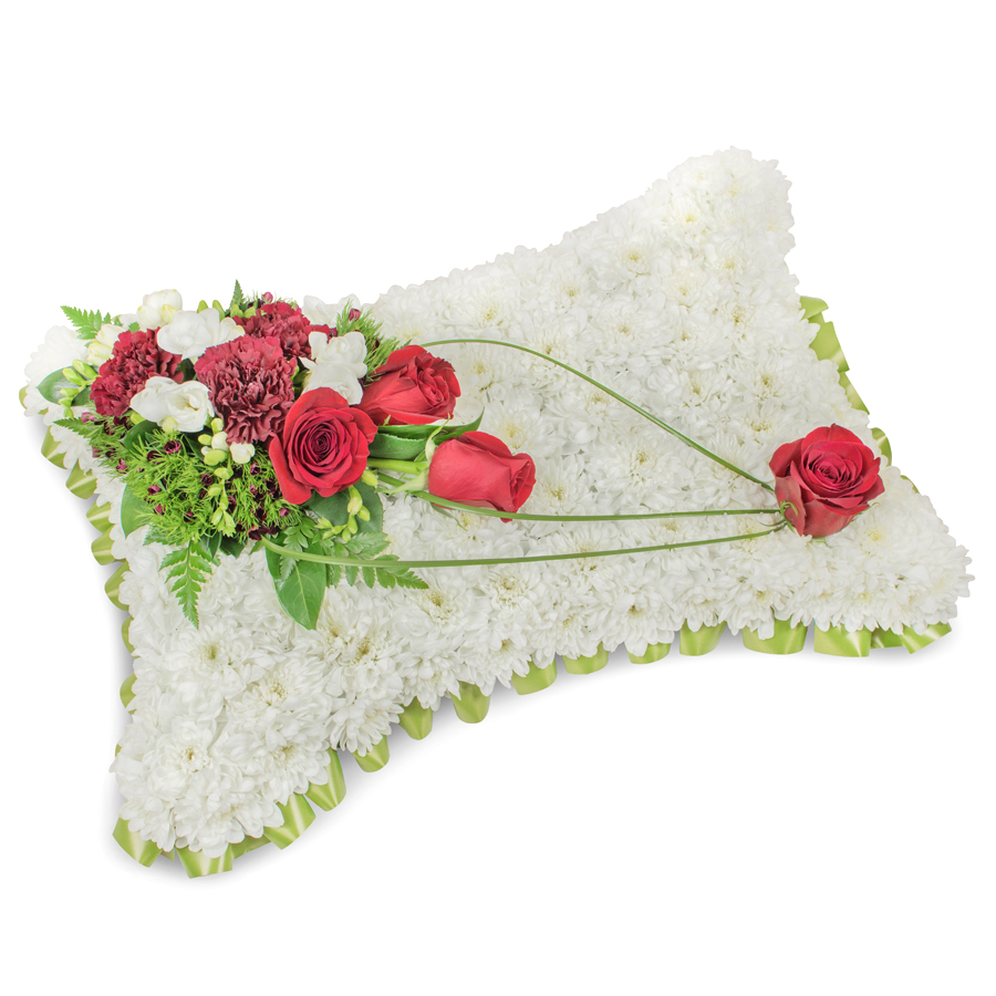 Convey your deepest sympathies with our luxurious floral arrangement featuring white chrysanthemums, vibrant red roses, fragrant white freesias, and elegant dark red carnations. Enhanced with dianthus and bear grass, this bouquet provides a unique and beautiful tribute.