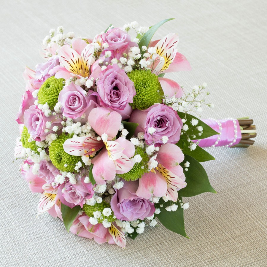 A Sincerely Yours Bridal Bouquet is a glorious combination of purple roses, pink-purple alstroemeria, green mini chrysanthemums, gypsophila flowers and aralia leaves. The handle is neatly wrapped with a pink ribbon with pearls. This colourful bouquet is an excellent choice for every bride!